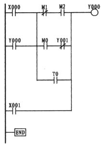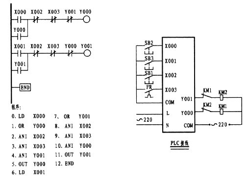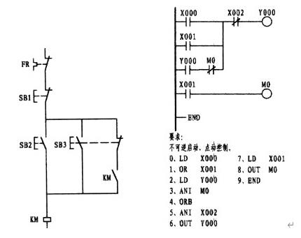 這一道題往往是初學者邁不過的一道坎。這主要是因為繼電器電原理圖使用的是復合按鈕,形成的思維定式所造成。從梯形圖中可以看出,X001為點動控制觸點,因左邊的電原理圖是使用的復合按鈕,思維上自然而然轉向了采用X001的常閉觸點,與X001的常開形成了與復合按鈕相似的效果,想象是不錯。要知道PLC在運行狀態下,是以掃描的方式按順序逐句掃描處理的,掃描一條執行一條,掃描的速度是極快的。如果是用X001的常閉代替M0的常閉的話,當按下外接點動按鈕時,X001常開觸點則閉合而常閉接點則斷開,但一旦松手其常閉觸點幾乎就閉合形成了自保,因此失去了點動的功能,變為只有啟動的功能。梯形圖中的第一梯級中的第二支路是由Y000的常開與中間繼電器M0的常閉相串后再與第一支路相并,在這樣觸點多的情況下如果允許應將它擺列在第一行,這樣在編程時可以少用了ORB指令。