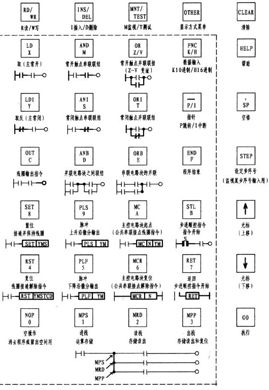 ①功能鍵:RD/WR......讀出/寫入,若在左下角出現R為程序讀出,若出現W則為寫入,即程序輸入時應出現W,否則無法輸入程序。按第一下如為R,再按一下則為W。INS/DEL......插入/刪除,若在程序輸入過程中漏了一條程序,此時應按該鍵,顯現I則可輸入遺漏程序。若發現多輸了一條程序,同樣按該鍵,顯現D則可刪除多余或錯誤的程序。MNT/TEST......監視/測試,T為測試,M為監視,同樣按該鍵,可相互切換。在初學時要學會使用監視鍵M, 以監視程序的運行情況,以利找出問題,解決問題。