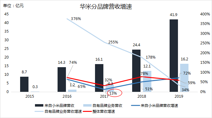 在招股書及年報中,華米會將營收按品牌來源劃分為來自小米品牌與來自自有品牌業(yè)務(wù)兩部分。