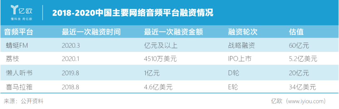 音頻行業很快受到資本的青睞。從2014開始,喜馬拉雅FM、蜻蜓FM、荔枝FM、多聽FM等音頻公司相繼完成多輪千萬美元量級的融資,資本的注入讓音頻行業的發展進入到一個新的階段。