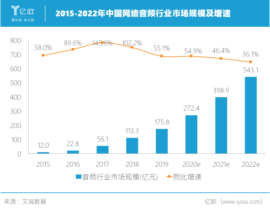 《中國網絡音頻行業研究報告》預計2020年網絡音頻行業市場規模達272.4億元,用戶規模將達5.42億。隨著在線音頻內容的進一步開放,以及用戶場景需求得到進一步挖掘,市場有望保持穩定快速增長態勢。